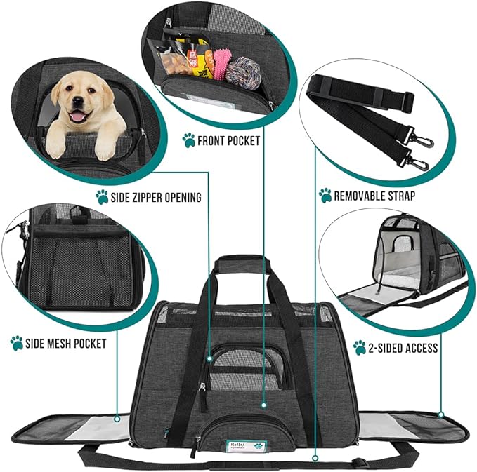 • AIRLINE APPROVED CAT CARRIER: Airline compliant and fits under most airplane seats, this tsa approved pet carrier is easy to carry on in different ways. Besides top handle strap and a removable shoulder strap, the pet travel bag is equipped with side buckles for car seat belt loops. Comes with an identification name tag, and a zipper pocket on the front to store pet stuff, treat, food, toy, or personal items, phone and cards, this soft cat taxi is the most convenient carrier for travels.