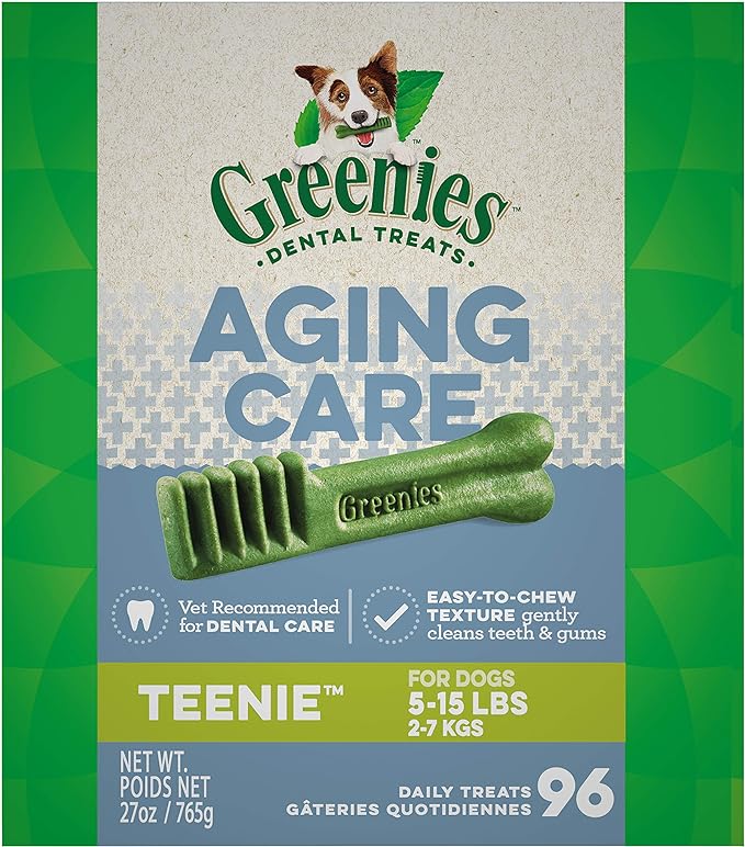 • Contains one (1) 27 oz. 96-count pack of GREENIES Aging Care TEENIE Size Natural Dental Dog Treats; Natural Dog Treats Plus Vitamins, Minerals, and Other Nutrients