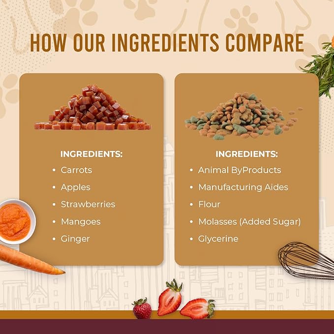 • HUMAN-GRADE, WHOLE FOODS: We use fresh, natural, human-grade, non-GMO, plant-based ingredients because they are healthy, easy to digest and delicious! Many pet food products are heavily processed and use harmful manufacturing aids.
