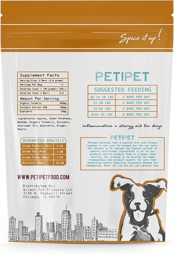 • ITCHING & ALLERGY RELIEF SUPPLEMENT: PETIPET Turmeric Bars are plant based soft chews made with natural and organic ingredients that help address the root underlying cause of allergies. Turmeric and Curcumin work together to boost the immune system and improve digestion. Quercetin is an all natural ingredient that has strong antioxidant & antihistamine properties and works to relieve your pup of itchy hot spots and skin irritation from environmental and food allergies.