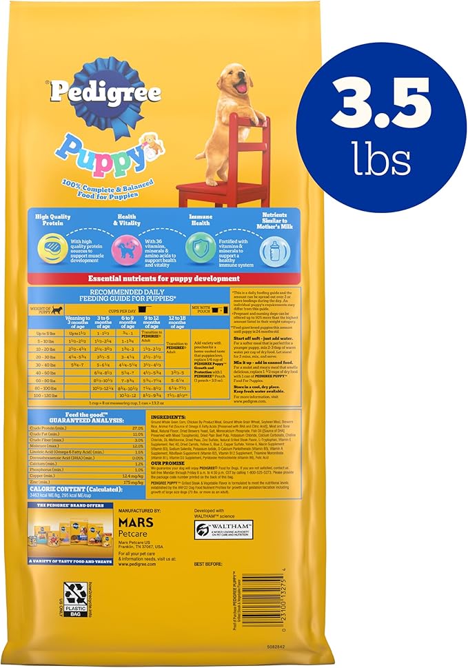 • Contains one (1) 3.5 lb. bag of PEDIGREE Puppy Growth & Protection Dry Dog Food Grilled Steak & Vegetable Flavor