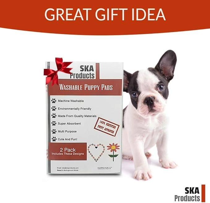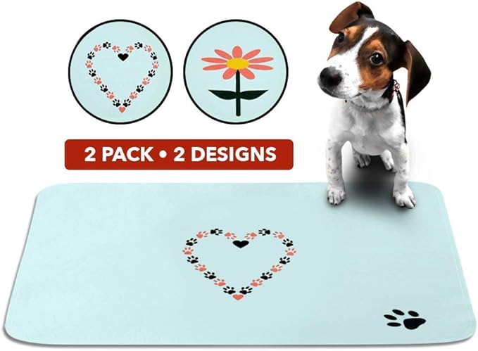 • FUN DESIGNS YOU’LL LOVE: This 2 pack of reusable puppy pads includes cute canine-inspired designs. The flower and heart prints! Each large puppy pad measures 27 x 30 inches.