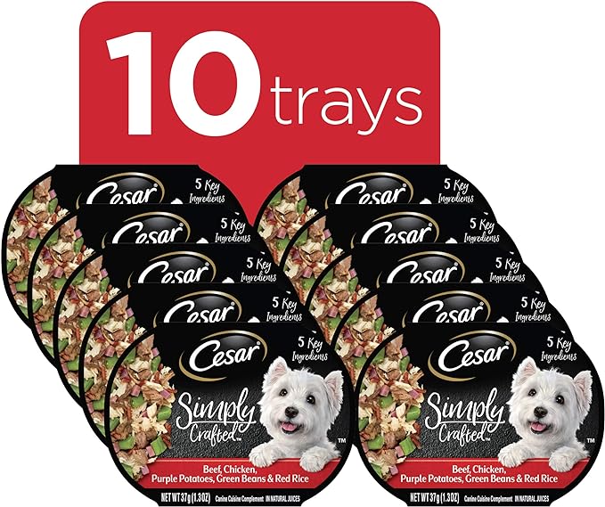 • Contains ten (10) 1.3 oz. tubs of CESAR SIMPLY CRAFTED Canine Cuisine Complement Adult Wet Dog Food Topper with Beef, Chicken, Purple Potatoes, Green Beans & Red Rice