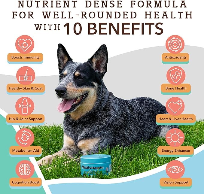 • The power of nature: Our Mulitvitamin chews for dogs are made with naturally derived ingredients and is a powerhouse of essential vitamins and minerals that support your dog's immunity, skin and fur health, digestion, brain health, and heart health with essential nutrients like Calcium, phosphorus, iron, zinc, selenium, vitamin E, thiamine, niacin, and biotin