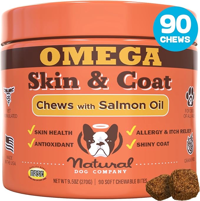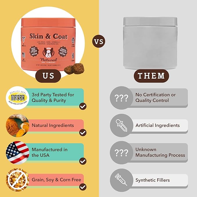 • Effective Dog Skin & Coat Supplement: Natural Dog Company Skin & Coat Supplement Chews may help support your dog's health from the inside out with our nutrient dense formula Enriched with biotin, vitamin C, vitamin E, EPA, DHA, omega-3 and omega-6 fatty acids, Linoleic Acid, Alpha Linolenic Acid