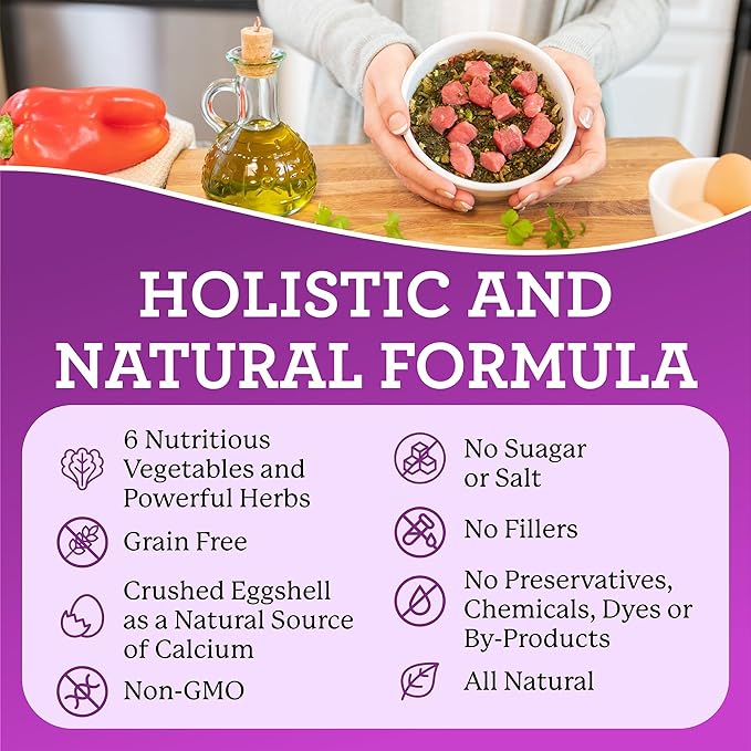 • Green food pre-mix makes an ideal base for a nutritionally complete low-carb diet; 100% grain-free, our holistic blend of six (6) nutritious dehydrated vegetables contain absolutely no dies, fillers, wheat, corn, soy, nor preservatives