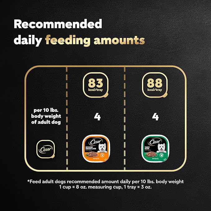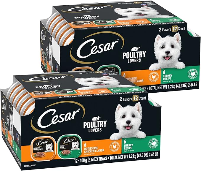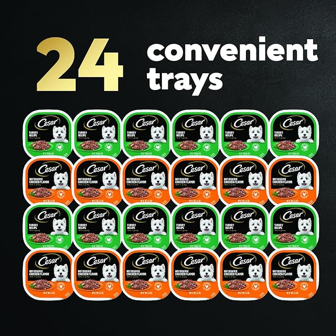 • 24-Pack: Contains twenty-four (24) 3.5 oz packs of CESAR Filets in Gravy Poultry Lovers Variety Pack Adult Wet Dog Food