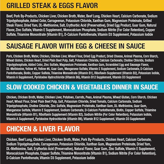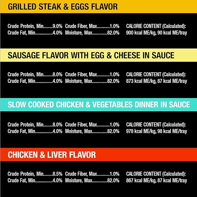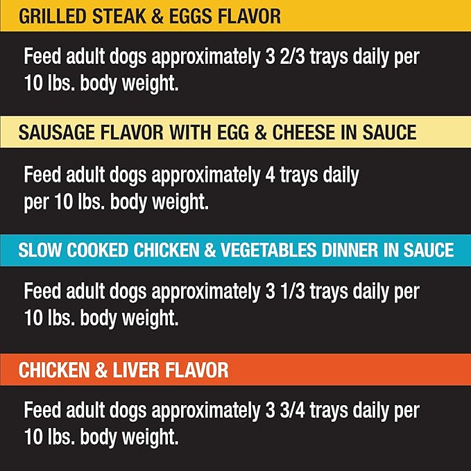 • Contains one (1) 24-count case of 3.5 oz. trays of CESAR Wet Dog Food HOME DELIGHTS & Classic Loaf in Sauce Breakfast & Dinner Variety Pack: (6) Grilled Steak & Eggs Flavor, (6) Sausage Flavor With Egg & Cheese, (6) Chicken & Liver Recipe, (6) Slow Cooked Chicken & Vegetables Dinner