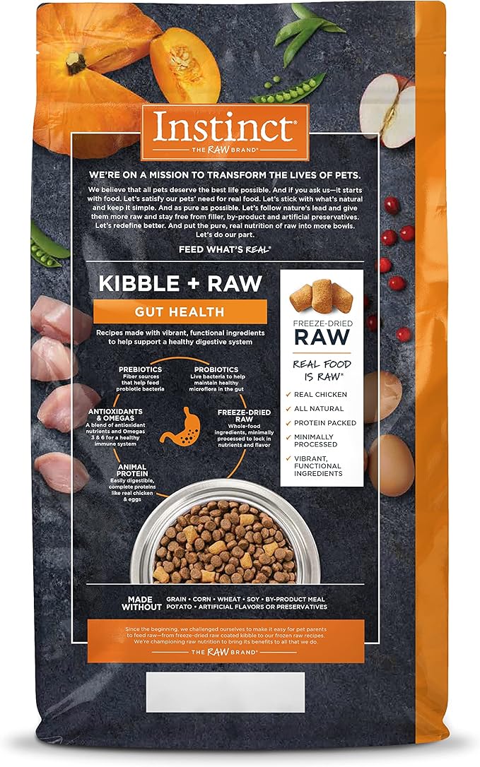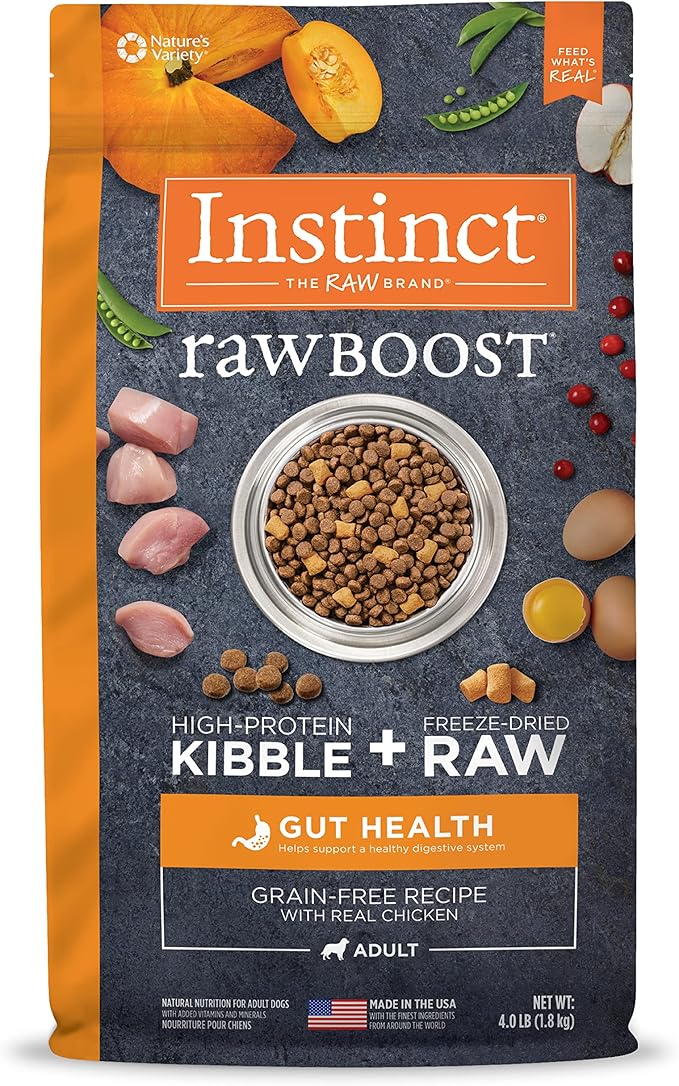• GRAIN FREE DOG FOOD WITH FREEZE DRIED RAW FOR GUT HEALTH: Instinct Raw Boost dry dog food combines high protein, grain free kibble with natural bites of freeze dried raw. Cage free chicken is the #1 ingredient plus all natural, functional ingredients.