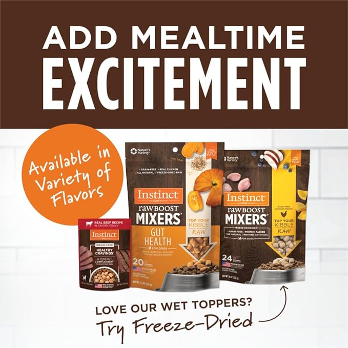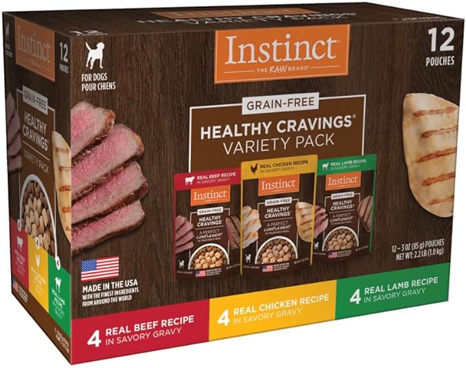 • GRAIN FREE DOG FOOD TOPPER VARIETY PACK: Instinct Healthy Cravings wet dog food topper variety pack contains the perfect selection of natural dog food toppers or dog treats. Add the delicious taste and variety that small dogs to large dogs crave.