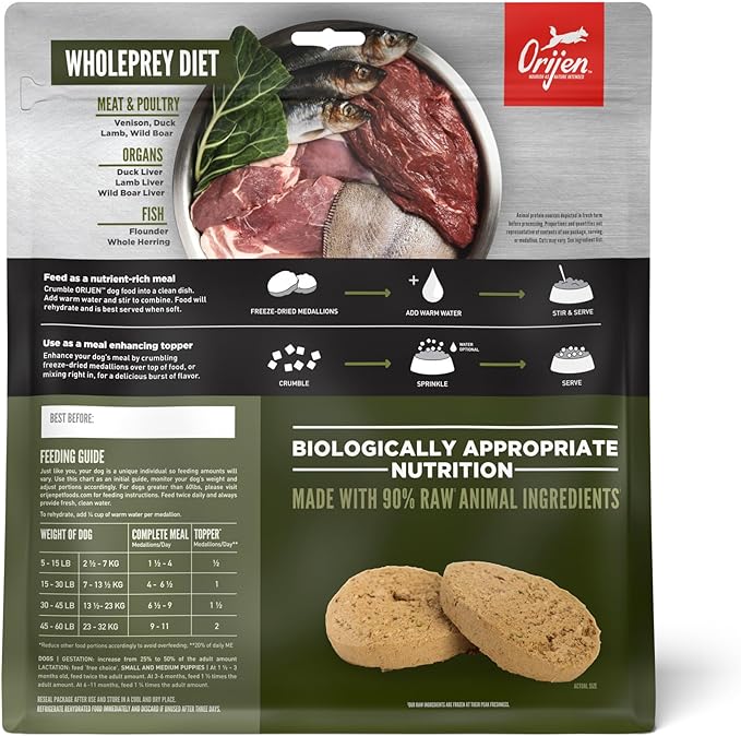 • ORIJEN freeze dried dog food is a concentrated source of animal protein that can be served as a meal or used as a dog food topper