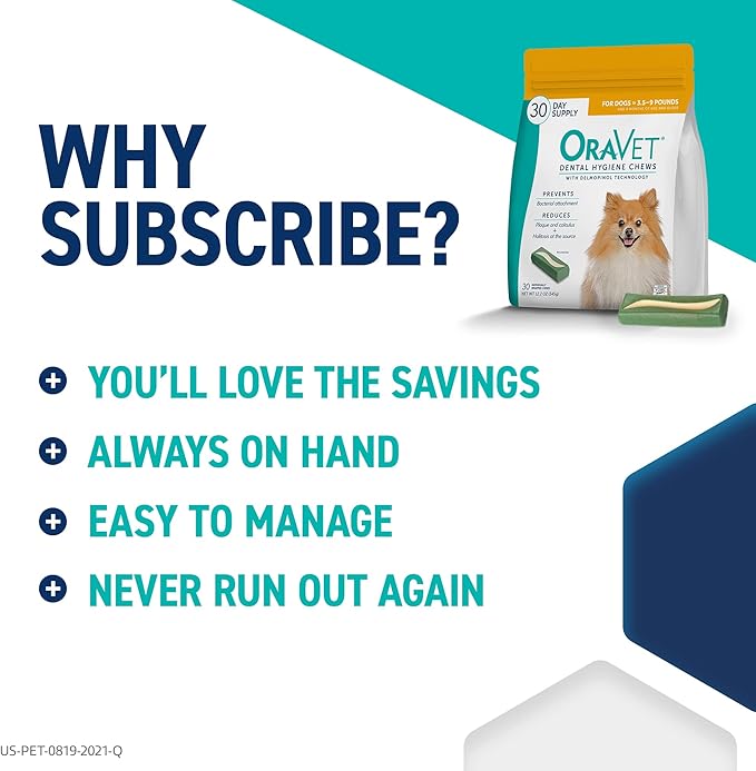 • Made for dogs six months of age or older, OraVet comes in easy-to-feed individually wrapped chews that are formulated to be easily digestible and have a poultry flavor with a vanilla aroma that dogs love