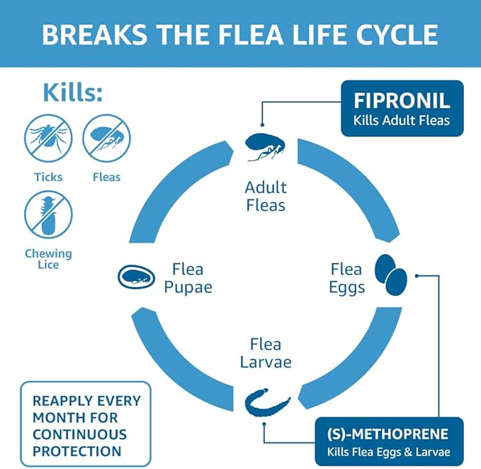 • Active ingredients Fipronil and (s)-methoprene prevent flea infestations by killing flea eggs, flea larvae, mosquitos, biting flies and chewing lice