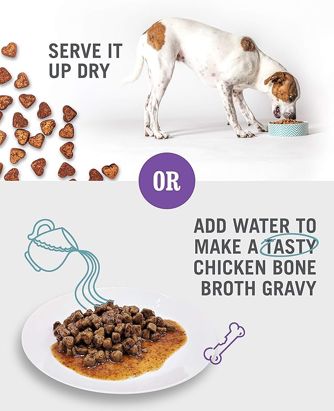 • Serve Wet or Dry - Serve a classic, tried and true, crunchy bowl of oven-baked kibble or simply add a splash of water to make instant, savory bone broth gravy—chef’s choice. Either way, ya can’t go wrong.