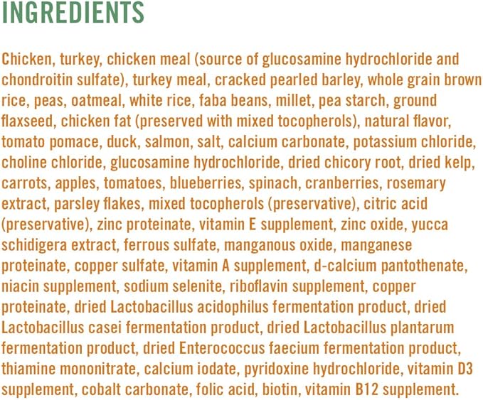 • MADE WITH REAL INGREDIENTS: Each 28 pound bag of our Large Breed Adult dry dog food is made with real chicken, turkey, salmon, duck, cracked pearled barley, whole grain brown rice, veggies, fruit and herbs