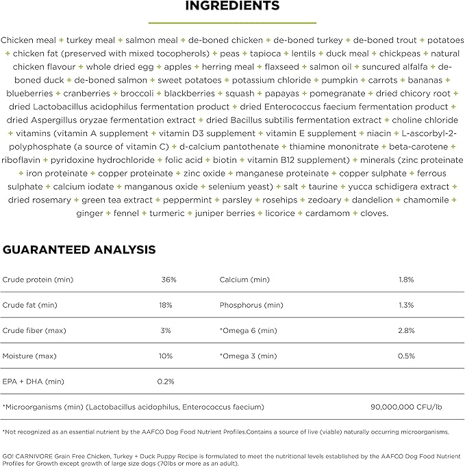 • PROTEIN-RICH FOOD TO SUPPORT STRONG, LEAN MUSCLES: The first six ingredients and 87% of the protein in our grain free CARNIVORE Chicken, Turkey + Duck puppy food comes from real premium-quality meat + fish.