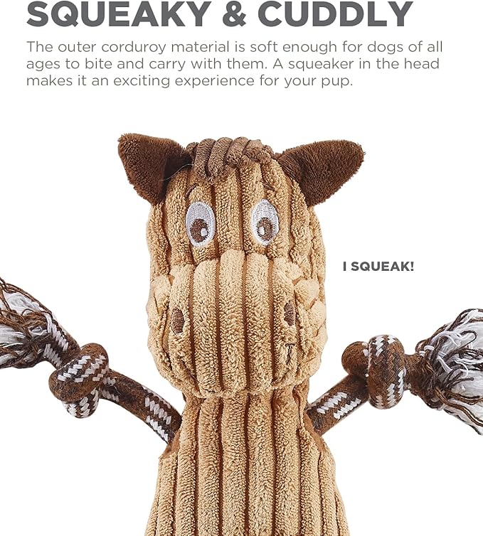 • SQUEAKY & CUDDLY: The soft outer corduroy material is soft enough for dogs of all ages to bite and carry with them. A stimulating squeaker in the head of this dog toy makes it an exhilarating experience for your pup each time it's chomped.