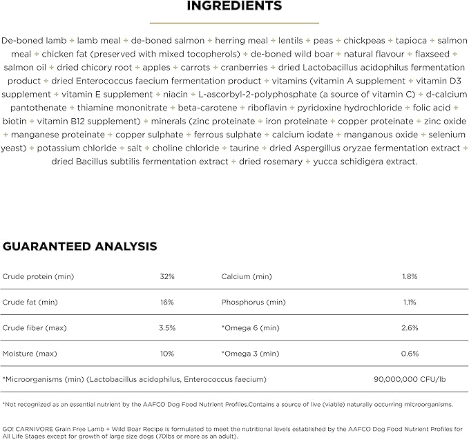 GO! SOLUTIONS Carnivore Grain Free Dog Food, 22 lb – Lamb + Wild Boar Recipe – Protein Rich Dry Dog Food – Complete + Balanced Nutrition for All Life Stages