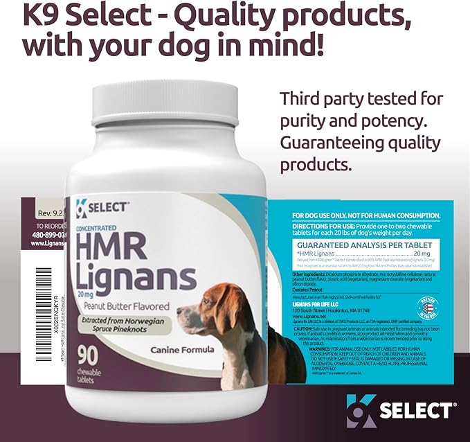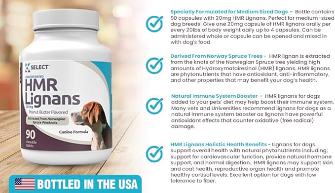 • TAILORED DOSAGE FOR MEDIUM BREEDS: Perfectly designed for medium-sized dogs, our 90-tablet bottle delivers a precise 20mg of HMR Lignans per tablet. This ensures tailored and effective support for your dog's specific needs, promoting their optimal health and well-being.