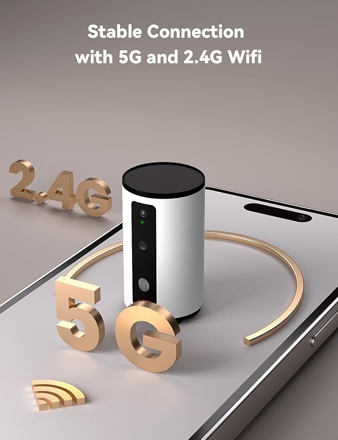• Smart APP Control: WOPET Smart Pet Camera is compatible with both 5GHz and 2.4GHz WiFi systems, allowing you to program and monitor your pet's meals anywhere and anytime, to see,talk, play, and interact with your pet.Connect with your pet while you are away with the supported audio chat/recording.Sharing your favorite moment on social media directly if preferred.