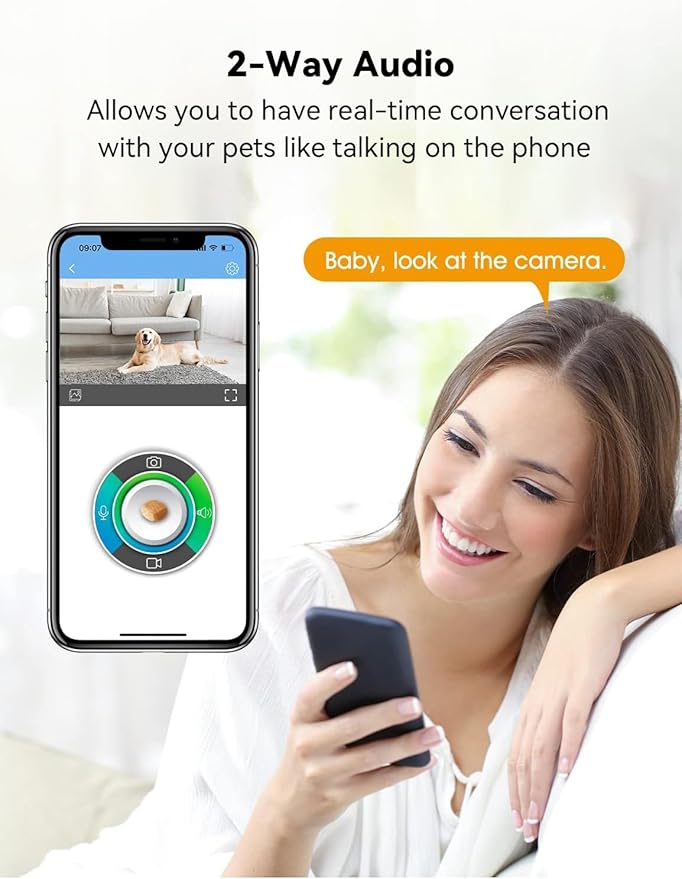 • Two Way Audio: Built-in advanced microphone and speaker for clear two-way audio conversations. Let you listen, talk and reward your pet's favorite snack or play & interact with your pet anytime, anywhere, Not only can you see what's happening at home, but also send voice commands, scare off intruders and talk with loved ones, even when you're away.