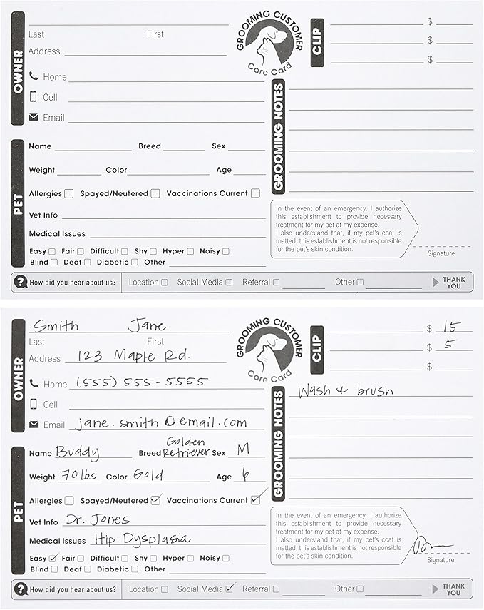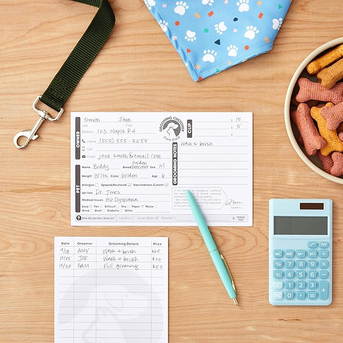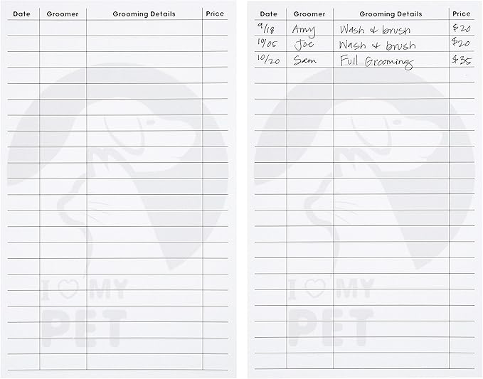 • Easy-to-Write: Clear black & white font allows easy input of contact info, pet's name, breed, sex, weight, color, age, and medical issues; reverse side captures the date, groomer details, and price