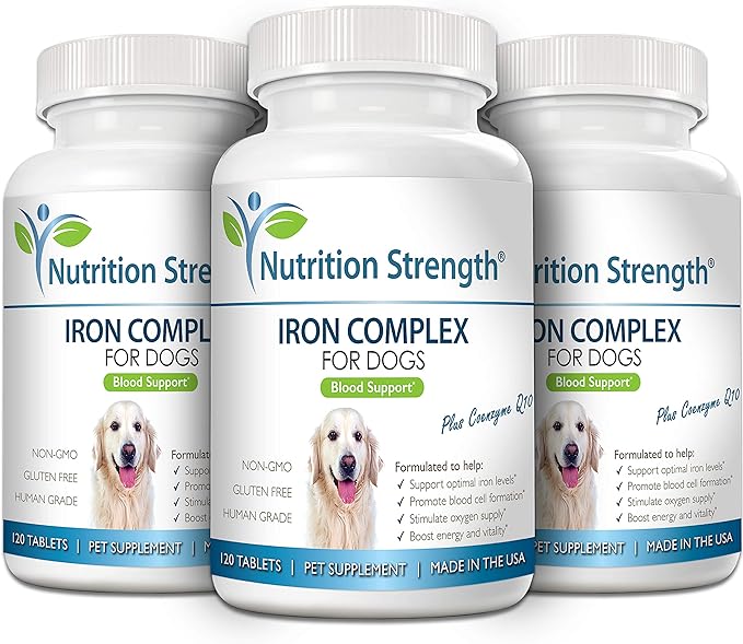 • Made in the USA: Nutrition Strength's iron for dogs to support blood health, promote blood cell formation and oxygen supply, iron supplement for anemic dogs with vitamin C, folate and vitamin B12 is human grade; our premium canine iron tablets meet the strictest animal supplement manufacturing guidelines, to guarantee your pet's safety, and are made with carefully selected, high quality ingredients for optimal results