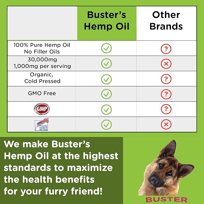 • ADVANCED HIP AND JOINT SUPPORT: Buster's Hemp Oil is specially formulated with Glucosamine and Lubricating Hemp Oil to boost joint mobility across all breeds and ages. A chondroprotective agent, glucosamine promotes a reduction in friction and pain for pets growing older or recovering from injuries, and offers a comforting cushion for those suffering from hip dysplasia or spinal disc issues. Return your pet's love with Buster's Glucosamine-Enriched Hemp Oil, and help them live more comfortably.