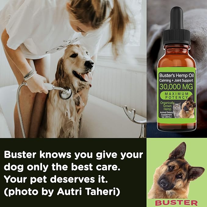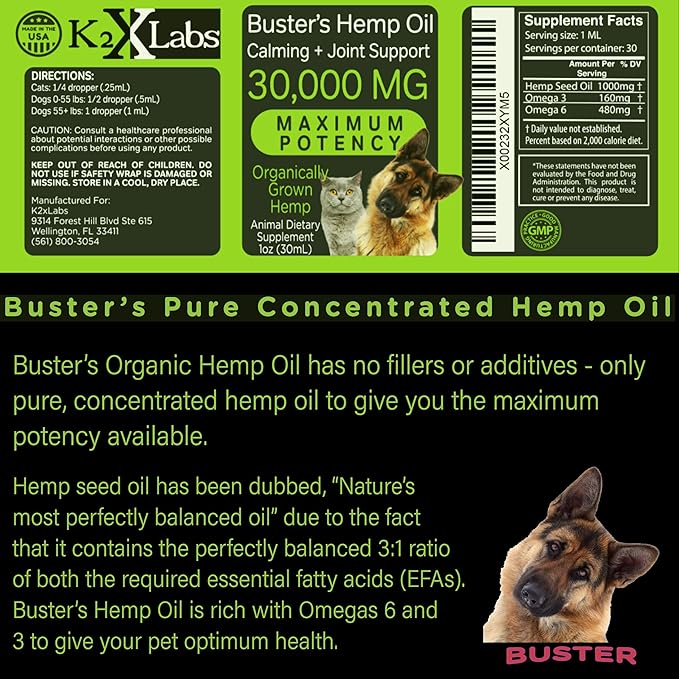 • OPTIMAL OMEGA BALANCE FOR PEAK HEALTH WITH HEMP OIL: Buster's highly concentrated pet hemp oil is packed with antioxidants, flavonoids, vitamins, and trace minerals that promote cellular renewal and healing. This powerful combination aids in reducing swelling and serves as an effective hip and joint supplement for dogs. The all-natural formula of Buster's boasts an optimal balance of omega-6 to omega-3 fatty acids, potentially preventing a range of conditions, including cardiovascular issues.