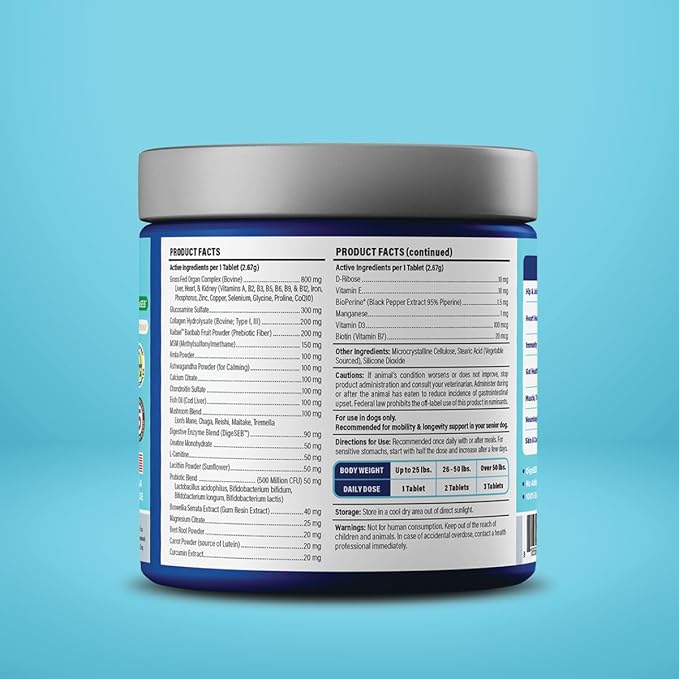 • NATURAL INGREDIENTS: Formulated with natural ingredients, no artificial fillers or colors, and a nutrient-dense, grass-fed organ meat complex to give it a natural meaty flavor, this supplement is a treat for your dog