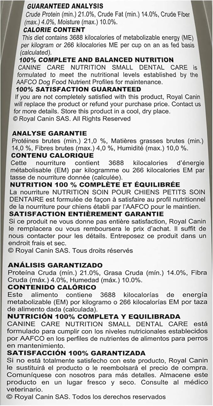 • DENTAL CARE FOR SMALL DOGS: Royal Canin Dental Care Dry Dog Food is formulated for small adult dogs 10 months and older weighing up to 22 lb that are prone to dental tartar