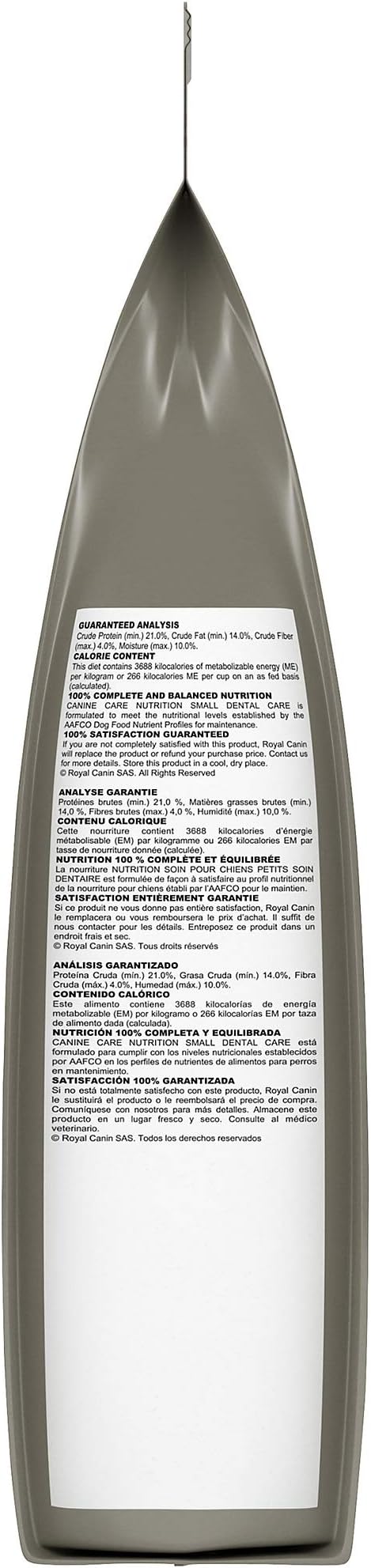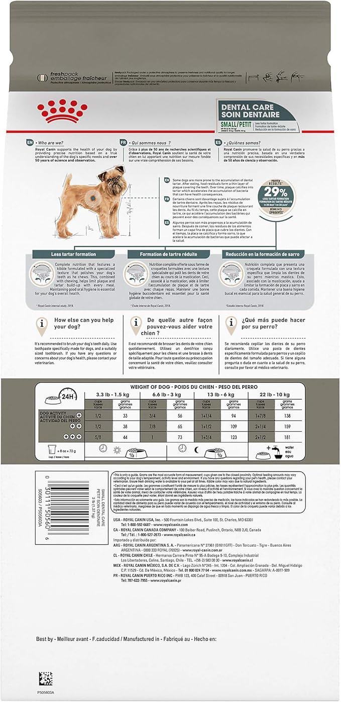 • DENTAL CARE FOR SMALL DOGS: Royal Canin Dental Care Dry Dog Food is formulated for small adult dogs 10 months and older weighing up to 22 lb that are prone to dental tartar