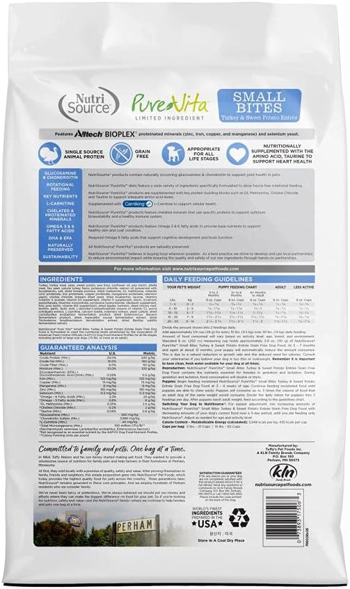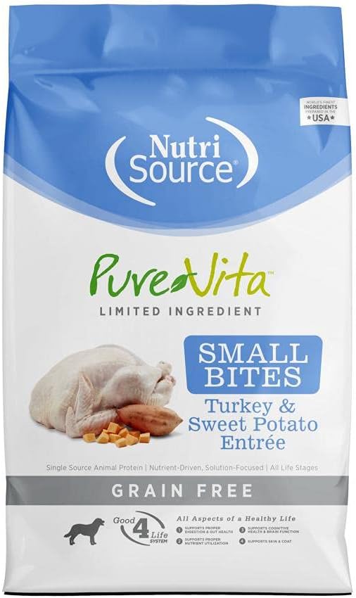 • As a member of our grain free series, NutriSource Pure Vita Turkey and Sweet Potato Small Bites Dry Dog Food is formulated to meet AAFCO guidelines for all lifestages