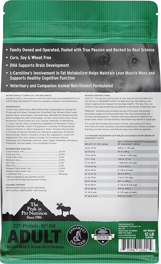 • Annamaet Adult is made with low ash chicken and brown rice, and designed for older dogs or dogs with slower metabolisms