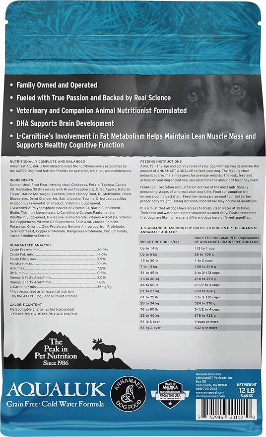 Annamaet Grain-Free Aqualuk Cold Water Fish Formula Dry Dog Food, (Salmon & Herring), 12-lb Bag