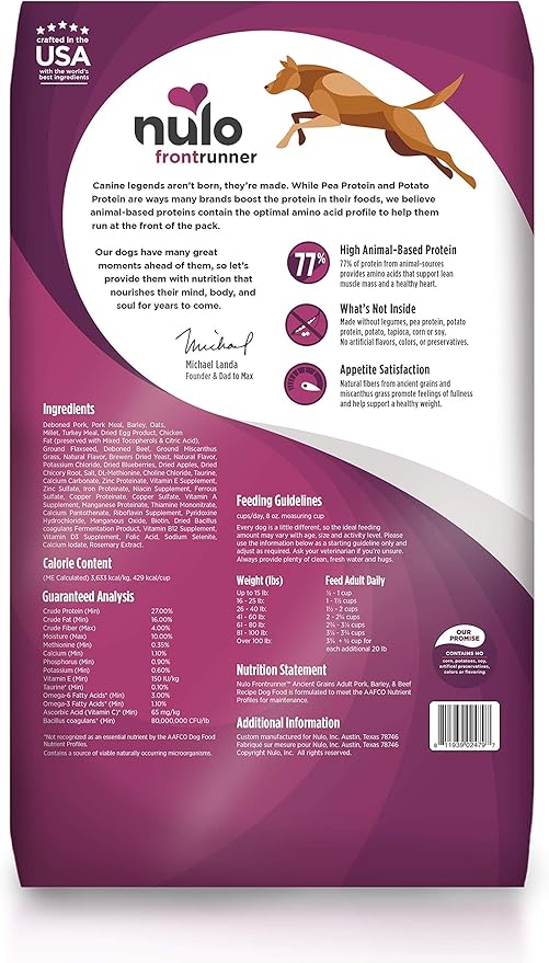 Nulo Frontrunner Dry Dog Food for Adult Dogs - Grain Inclusive Recipe with Pork, Barley, & Beef - All Natural Pet Foods with High Taurine Levels - Animal Protein for Lean Strong Muscles