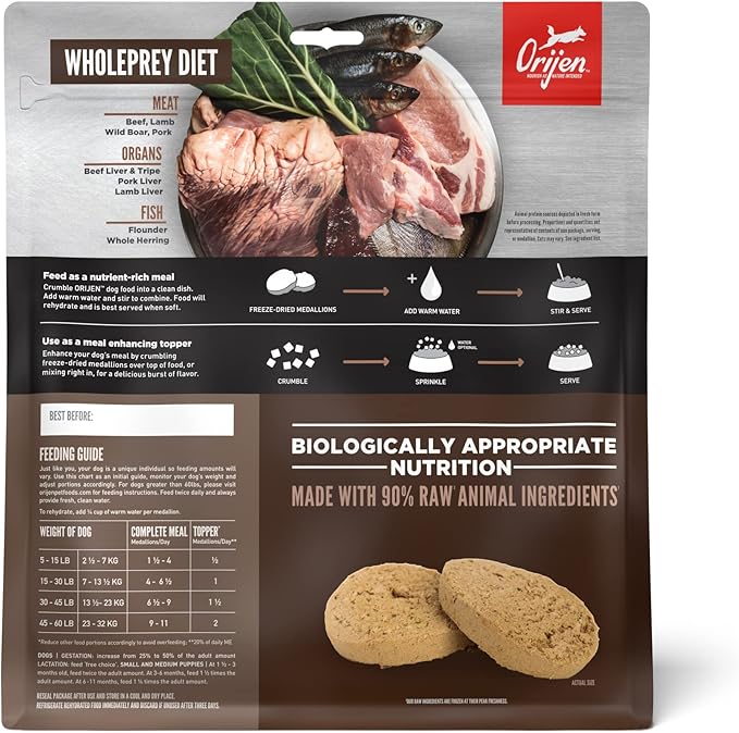 • ORIJEN freeze dried dog food is a concentrated source of animal protein that can be served as a meal or used as a dog food topper