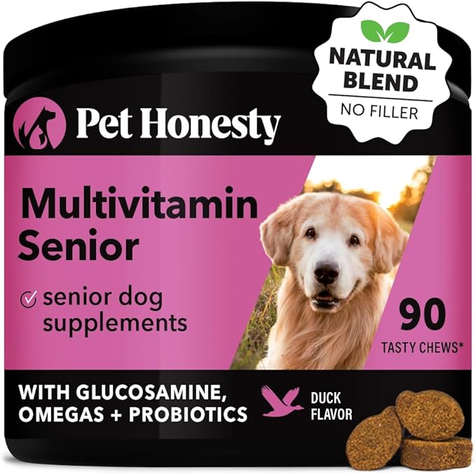 Pet Honesty Senior Dog Multivitamin - Essential Dog Vitamins and Supplements - Glucosamine, Probiotics, Omega Fish Oil for Dogs Health & Heart- Dogs Vitamins Health Supplies (Duck 90 ct)