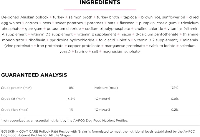 GO! SOLUTIONS Skin + Coat Care Wet Dog Food - Pollock Pâté with Grains - Complete & Balanced Nutrition for All Life Stages, 12.5 oz