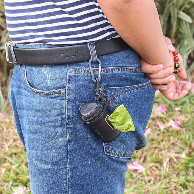 • ✅ WEAR-RESISTANT MICROFIBER LEATHER : simpletome used Waterproof, Double-layers Microfiber Leather, Reinforced sewing thread, STRONGER ALUMINIUM ALLOY CLIPS for leash, harness or waist belt. NOT like other waste bags dispenser, NO crack knocking noise. Keep you dogs quiet and no restless