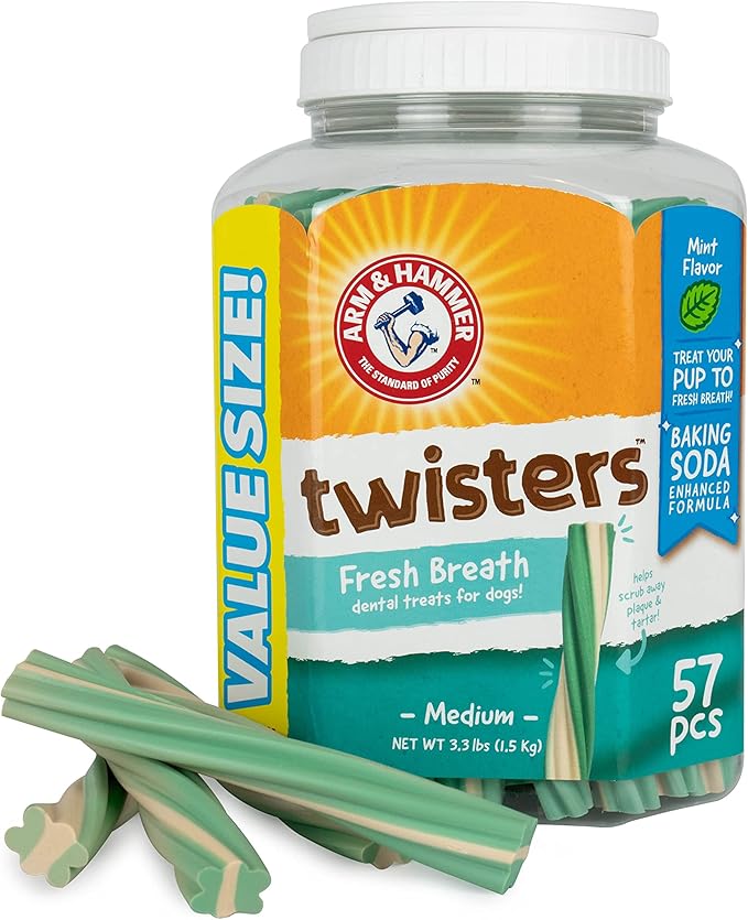 Arm & Hammer for Pets Twisters Fresh Breath Dental Treats for Dogs, Value Pack, 57 Pieces | Dental Dog Chews Fight Bad Doggie Breath, Plaque & Tartar Without Brushing