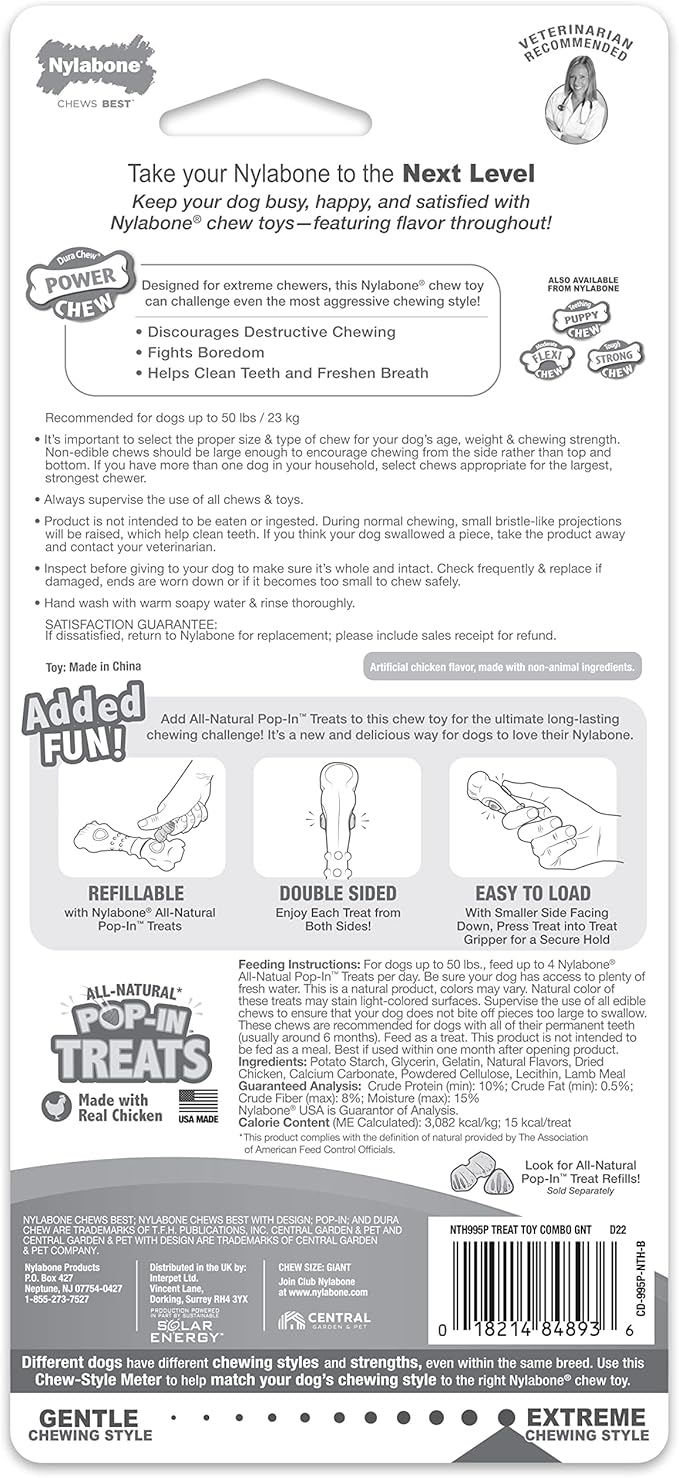 Nylabone Power Chew Knuckle Bone & Pop-In Dog Treat Toy Combo with Chicken Flavor Treat Refills, Chew Toy for Aggressive Chewers, Durable Treat Pouch, Large/Giant - Up to 50 lbs. (1 Count)