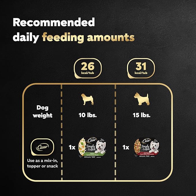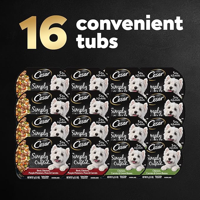 • 16-Pack: Contains eight (8) 1.3 oz of CESAR Simply Crafted Chicken, Carrots & Green Beans, and eight (8) 1.3 oz of CESAR Simply Crafted Beef, Chicken, Purple Potatoes, Peas & Carrots Variety Pack Adult Wet Dog Food Meal Topper, 1.3 oz., Pack of 16