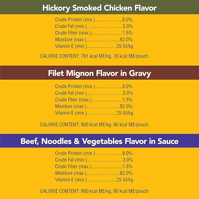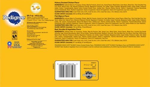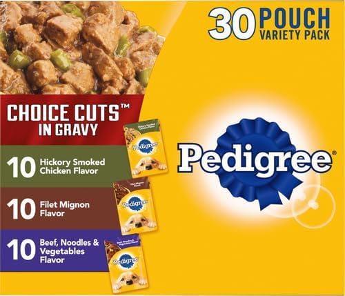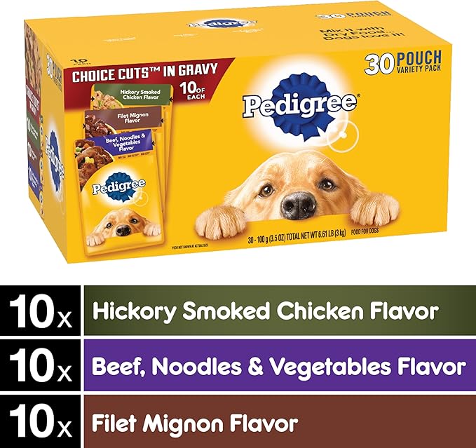 • VARIETY PACK CONTAINS THIRTY (30) 3.5 oz. pouches of PEDIGREE CHOICE CUTS IN GRAVY Wet Dog Food: (10) Beef, Noodles & Vegetable Flavor (10) Filet Mignon Flavor (10) Hickory Smoked Chicken Flavor