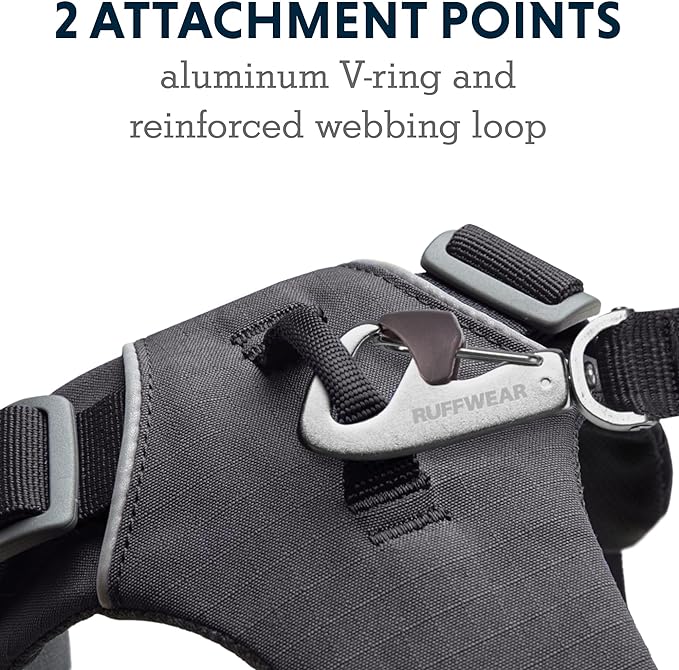 • 2 leash attachment points: Reinforced webbing at chest stands up to pulling and gives additional control (ideal for training, too); Aluminum V-ring centered on back