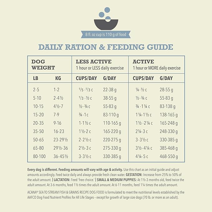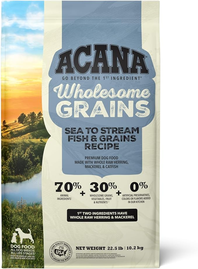 • One (1) 22.5 lb bag of ACANA Wholesome Grains Sea to Stream Fish & Grains Recipe Dry Dog Food
