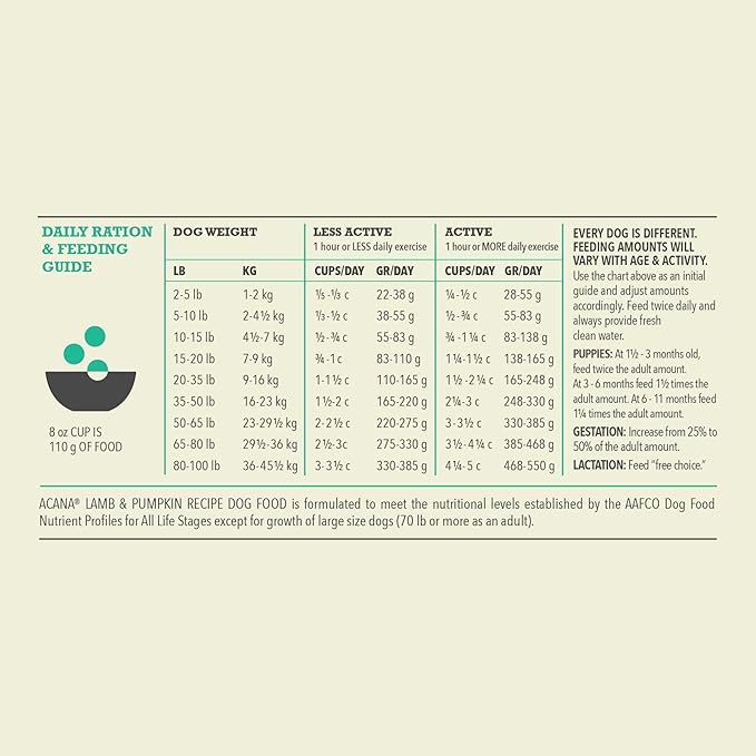 • One (1) 22.5 lb bag of ACANA Wholesome Grains Lamb & Pumpkin Recipe Dry Dog Food