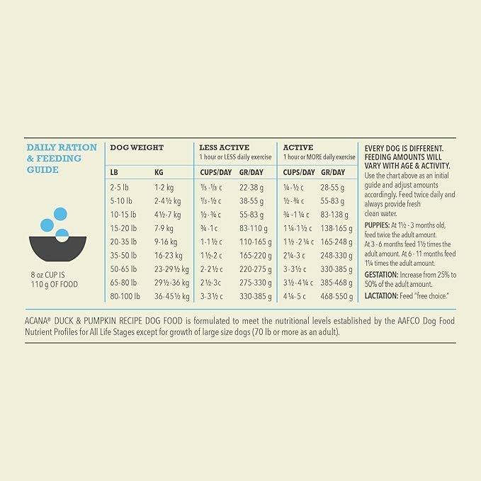 • One (1) 22.5 lb bag of ACANA Wholesome Grains Limited Ingredient Diet Duck & Pumpkin Dry Dog Food