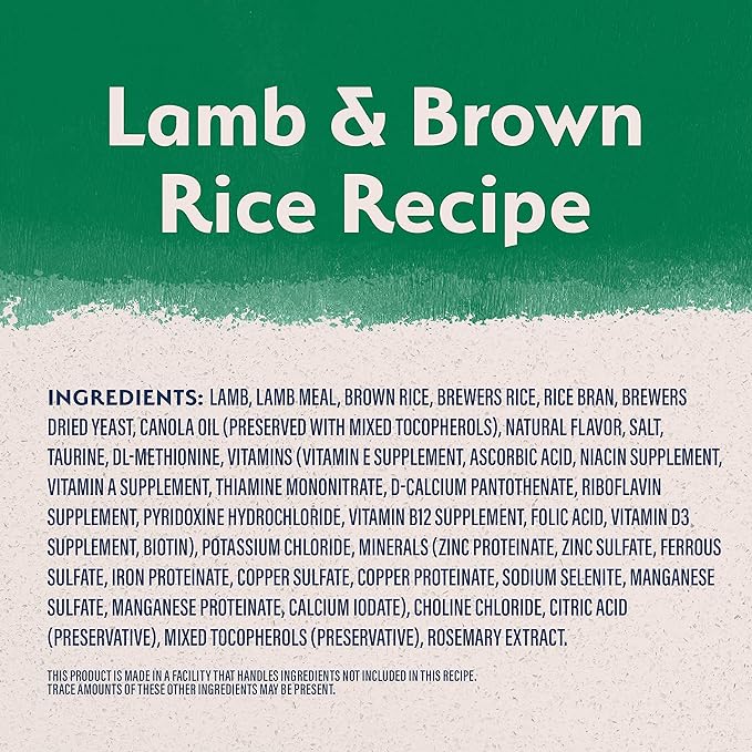 • LAMB IS THE FIRST INGREDIENT providing essential protein and amino acids to help maintain strong muscles; Brown Rice is included as a healthy and rich source of fiber for digestive health; Contains (1) 4-Pound Bag