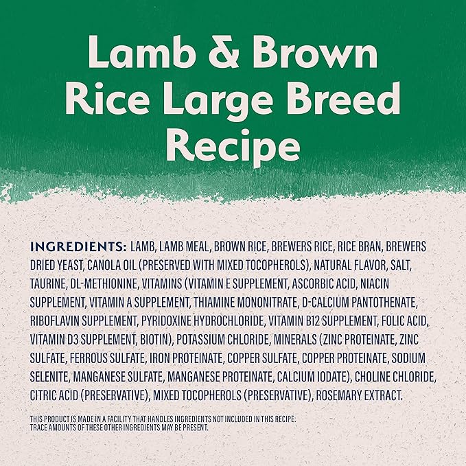 • LAMB IS THE FIRST INGREDIENT providing essential protein and amino acids to help maintain strong muscles; Brown Rice is included as a healthy and rich source of fiber for digestive health; Contains (1) 26-Pound Bag